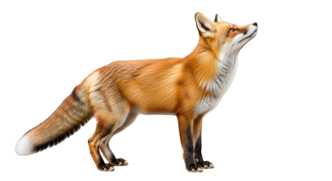 Isolated red fox stands attentively looking up, wild animal with luxurious fur coat