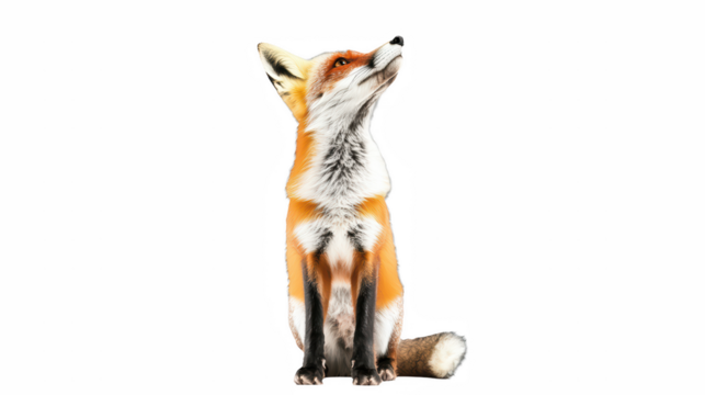 Playful red fox cub looking upward with curious expression side angle isolated on transparent background PNG