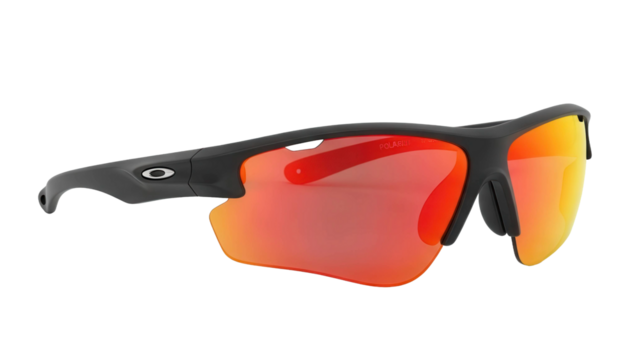 Black sport sunglasses with red mirrored lenses, cut out, stock png, isolated on transparent background