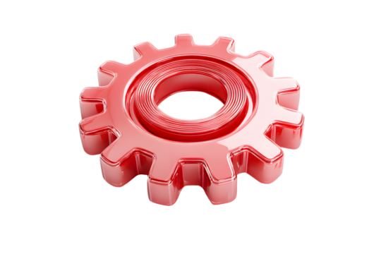 3D bright red gear cent isolated on cut out PNG or transparent background. God shape is distinct with bold red color. Gear is bright red standing out against.