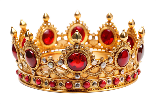Ornate gold crown with red gems isolated on transparent background