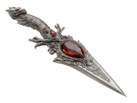 Intricate silver dragon dagger with a scaled handle red gemstone inlays and an ornate hilt.