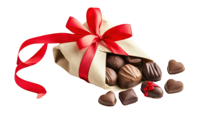 Red gift bag with golden heart pattern isolated on transparent background suitable for valentines day gifts and special occasion presents