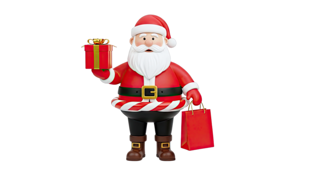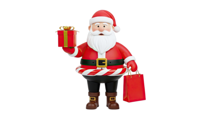 Joyful santa claus holding festive gift bags on transparent background