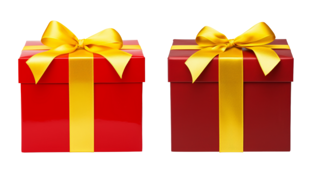 Set of red gift boxes adorned with shiny golden ribbons transparent background.