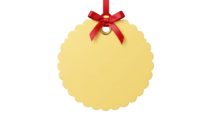 Festive gold tag with red ribbon isolated PNG, scalloped gift label for Christmas and holiday presents on transparent background
