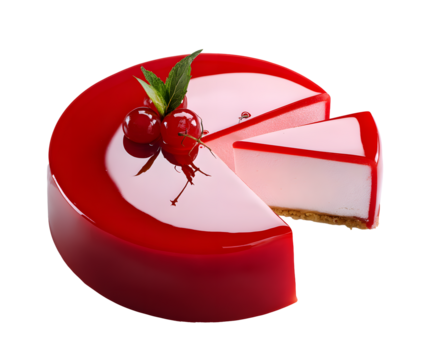 A delicious slice of cheesecake isolated on transparent background, topped with a glossy red glaze and two fresh, ripe strawberries