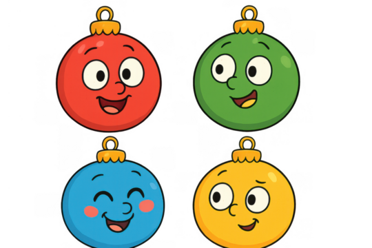Cartoon christmas baubles displaying happy, surprised, and shy expressions, bringing festive joy and playful holiday spirit. Transparent background