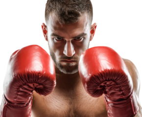 Aggressive boxer ready to fight with red gloves, shirtless, athletic build, intense gaze, punching stance, isolated on transparent background