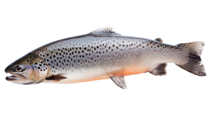 Trout whole fish, cut out element. A fish with a lot of spots on it. The fish is brown and white Isolated on transparent background, PNG