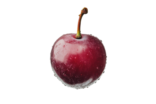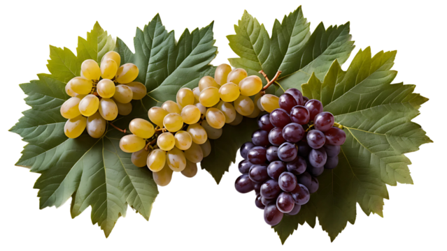 Ripe red grape cluster featuring verdant leaves, harvested fresh and arranged against transparent backdrop, ideal for culinary imagery