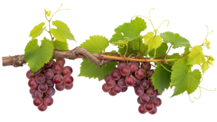 A cluster of ripe red grapes with vibrant green leaves isolated on a transparent background grape cluster
