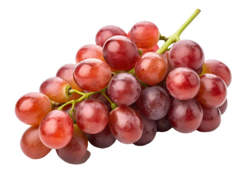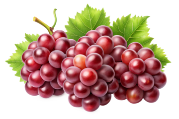 A close-up image of a bunch of red grapes hanging on a vine with green leaves, isolated on a white background
