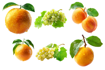 Set of apricot, grapefruit and red grapes hanging on the vine with green leaves isolated on white transparent background
