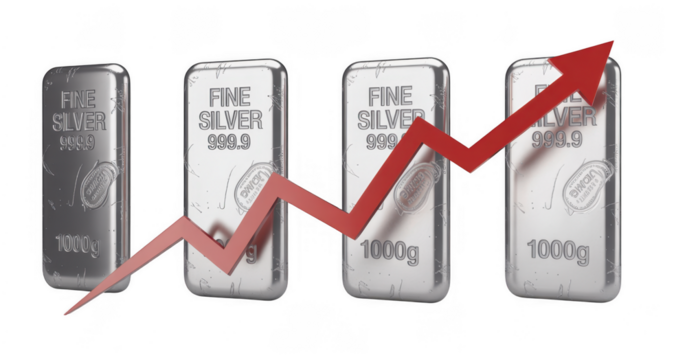 Four Fine Silver Bars with Rising Red Graph Line isolated on a transparent background