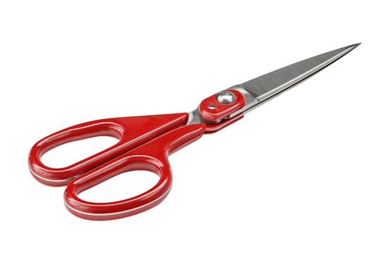 Pair of scissors featuring bright red grips and sharp silver blades, isolated on transparent background.
