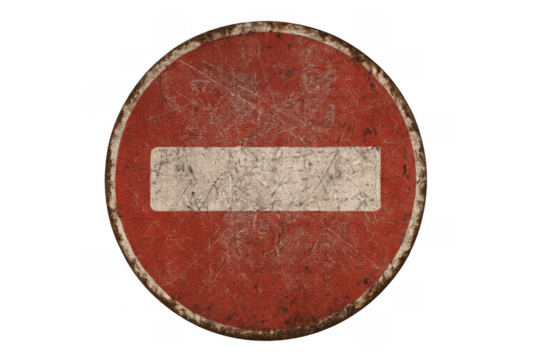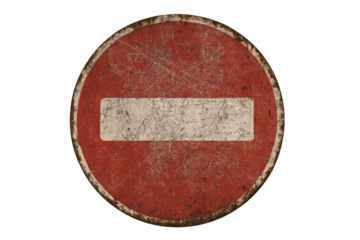 No entry road sign with weathered texture indicating prohibition, restriction, and warning on transparent background