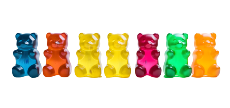 Row of sweet gummy bears painted in different colors isolated on transparent background
