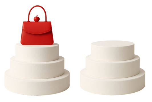 White multi-tier podium with a red handbag on top. Fashion. Advertising. Showroom. Branded accessories.