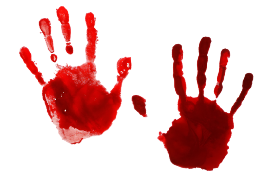 Bloody red handprint on transparent background representing crime, violence, murder, danger, and forensic evidence