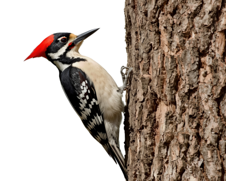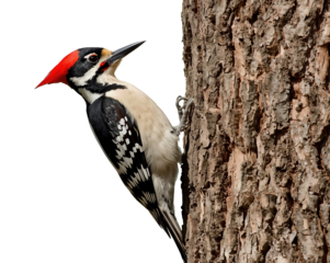 A striking great spotted woodpecker isolated on transparent background, displaying its bold black and white plumage, vibrant red cap, and strong beak in a dynamic stance