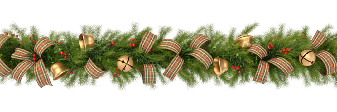 Festive Christmas garland border with elegant plaid ribbons, shimmering golden bells, and vibrant red berries, ideal for holiday decor, winter celebrations, cozy backgrounds, and aesthetic design.