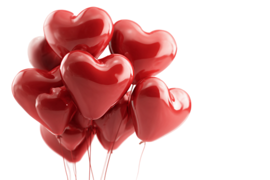 Floating red heart shaped balloons on transparent background
