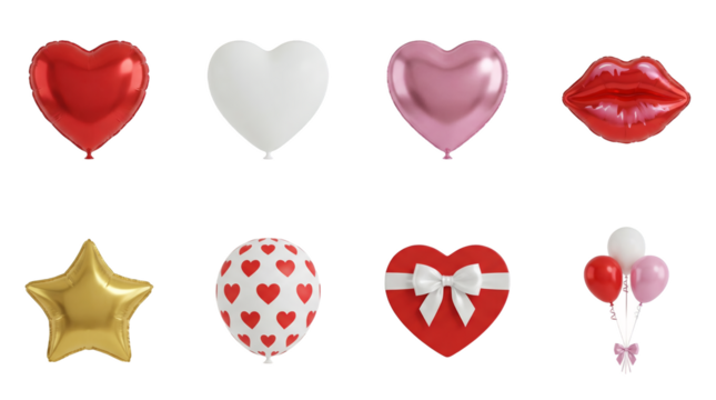 Valentine's Day balloon and gift set including heart shapes, red lips, gold star, and ribbon box isolated. Romantic celebration and party collection.