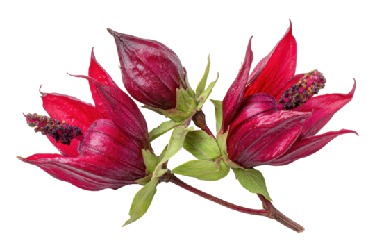 Red hibiscus sabdariffa calyces with green stems isolated on transparent background. Vibrant red hibiscus flowers isolated on white background.