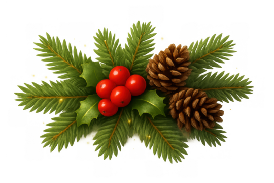 a macro, photorealistic christmas frame featuring deep green fir branches, frosty pine cones, and glossy red holly berries, isolated on a transparent background with ample copy space. concept of