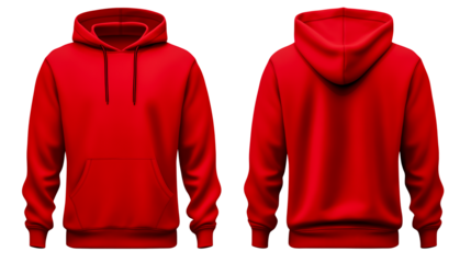 Red hoodie in front and back view, mockup isolated on transparent background