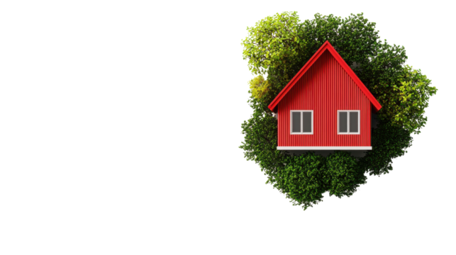 Red House Surrounded by Green Trees and Plants on a Black Background