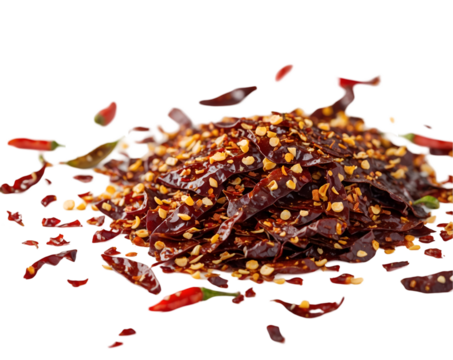 Isolated pile of chili flakes on a plain surface exhibiting a vibrant red hue and granular texture, presented against a uniform background creating a compelling visual impact