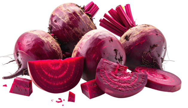 Close-up of beets with a vibrant red hue and various cut shapes, showcasing textures