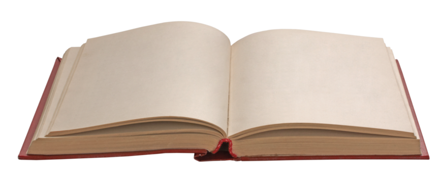 Red hardcover book lying flat with open edges, detailed texture and gold-lined pages isolated on transparent background