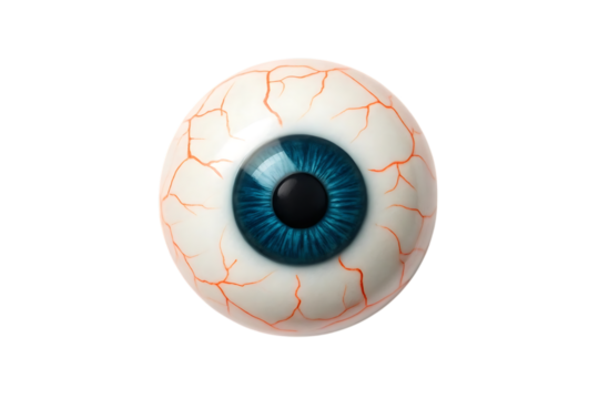 A realistic eyeball with a blue iris and red veins, attached to a stethoscope, isolated on transparent background