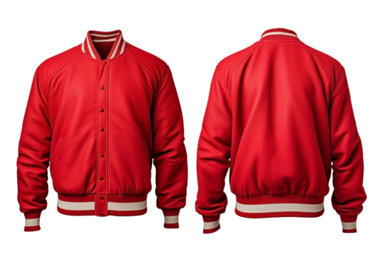 Front View and Back View to an Oversized Baseball Bomber varsity Red jacket PNG isolated on white and transparent background - Athletic Sports jacket Baseball College outerwear Street style Mockup