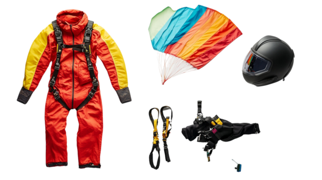 A collection of outdoor gear and clothing, including a red jacket, orange