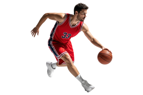 Basketball player in red jersey dribbling ball isolated on black background, perfect for sports and athletic themes