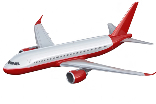A sleek. modern airplane in red and white colors soaring through a clear sky. symbolizing travel and adventure. with a background of clouds and sunlight