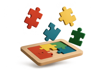 Blue red yellow puzzle pieces connecting isolated on a transparent background