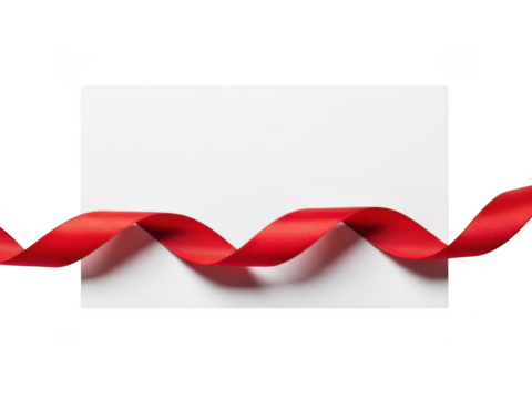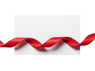 Blank white card with a wavy red satin ribbon stretched across the bottom, isolated on transparent background