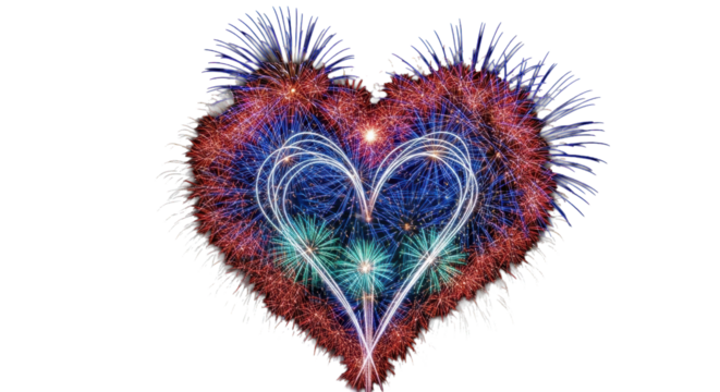 Dynamic explosion of red, white, and blue fireworks, detailed starbursts and cascading trails with sharp contours, isolated against a plain white studio background, captured at peak, Independence Day