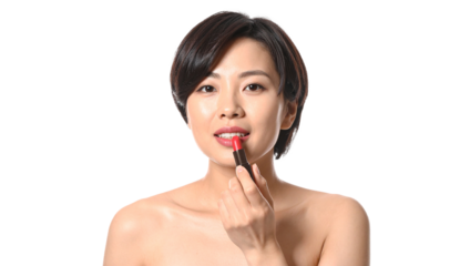 Applying red lipstick studio setting beauty tutorial minimalist environment close-up view makeup artistry