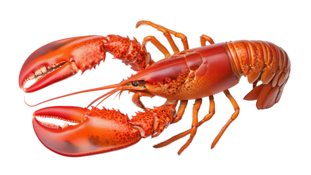 A vibrant red lobster displayed with its claws extended, showcasing its segmented body and textured shell, isolated on a transparent background