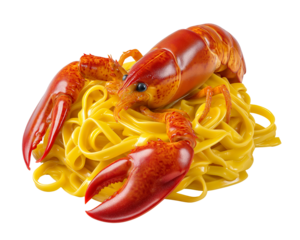Lobster Pasta Extravaganza A visually stunning composition features a succulent, red lobster artfully arranged atop a bed of golden pasta.