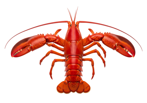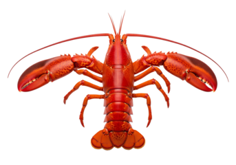 Red lobster with a hard, segmented exoskeleton and large, powerful claws raised slightly. PNG transparent.