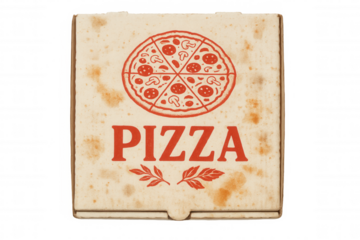 Pizza cardboard box with red logo, bearing slight stains, isolated on transparent background for delivery packaging design