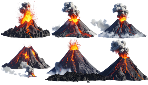 Six illustrations of erupting volcanoes, showcasing various stages of explosion and lava flow
