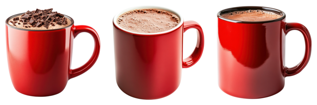 Vibrant red ceramic coffee mug, empty, isolated on a clean background.